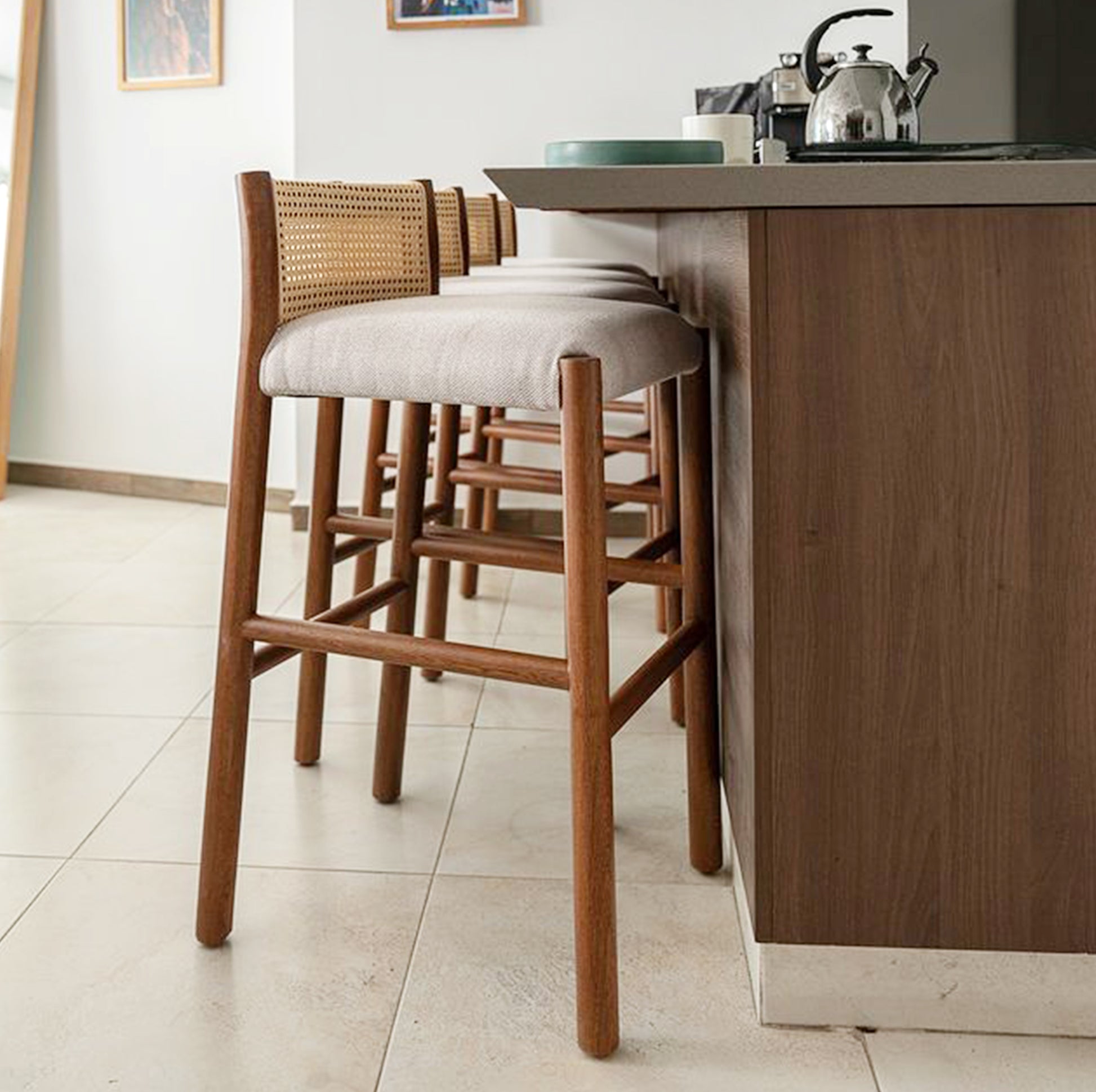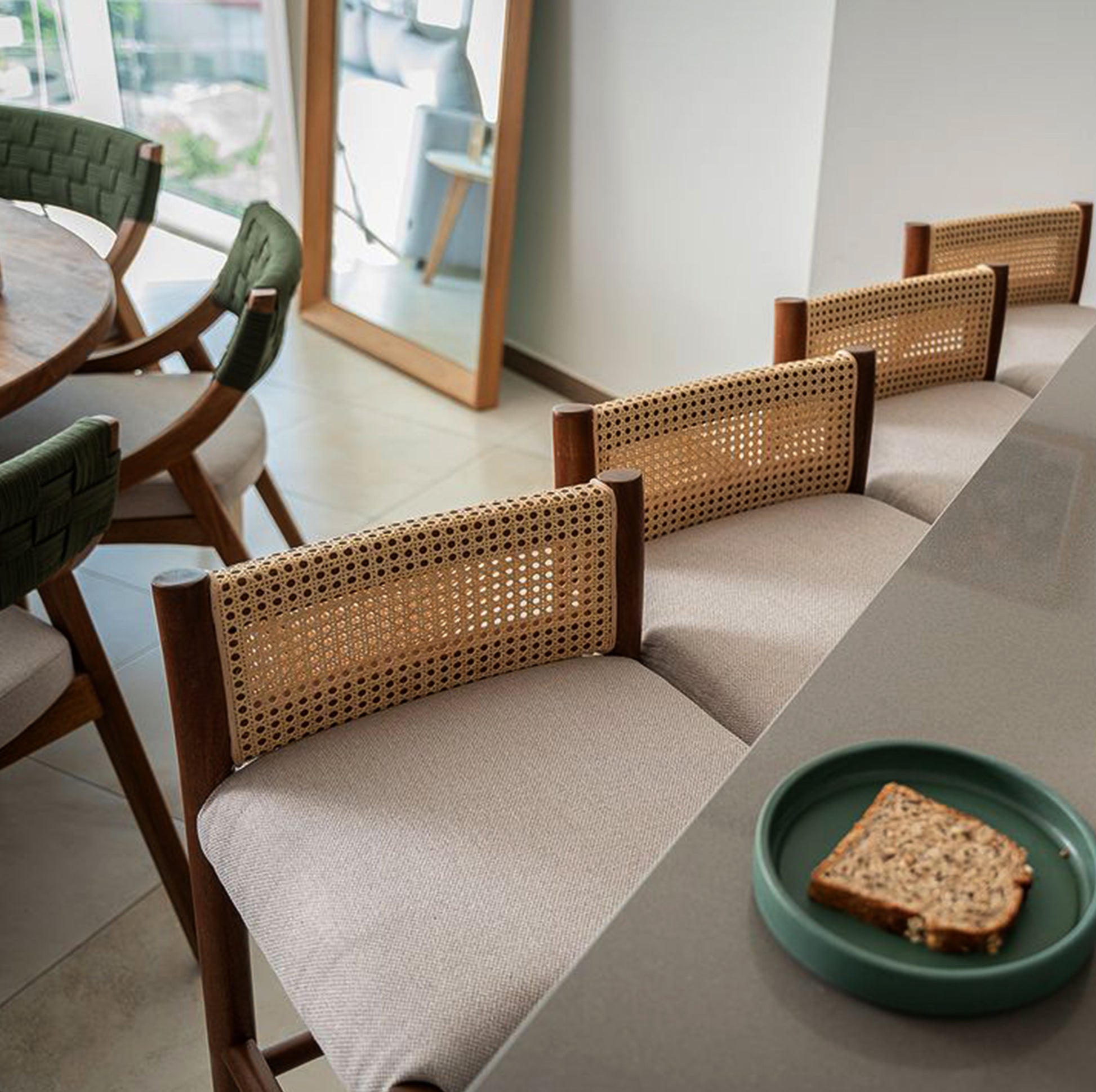 Estructura con madera rosa morada, respaldo bejuco y asiento de tela.